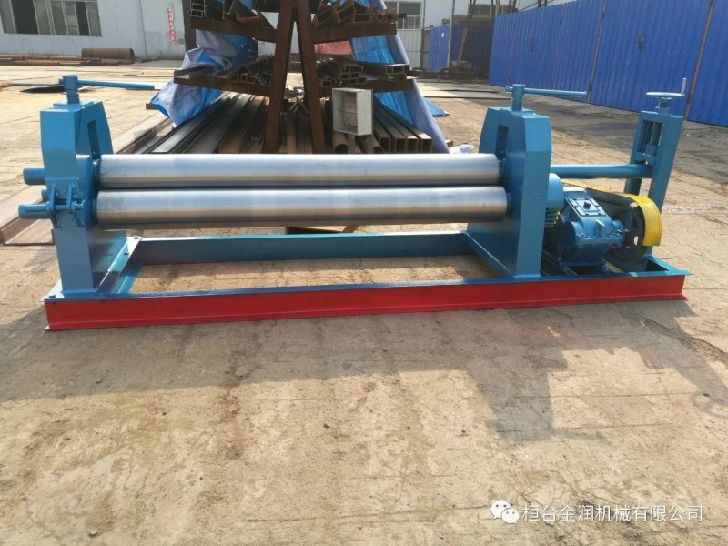 半自動91看片片成人,該機結構式為三輥對稱式,上輥在兩下輥中間對稱位置作垂直升降運動,通過人工擰動絲杆使上輥垂直升降,兩下輥作旋轉運動,通過減速機的輸出齒輪與下輥齒輪齧合,為卷製板材提供扭矩。上輥可分離取料手動升降起輥。